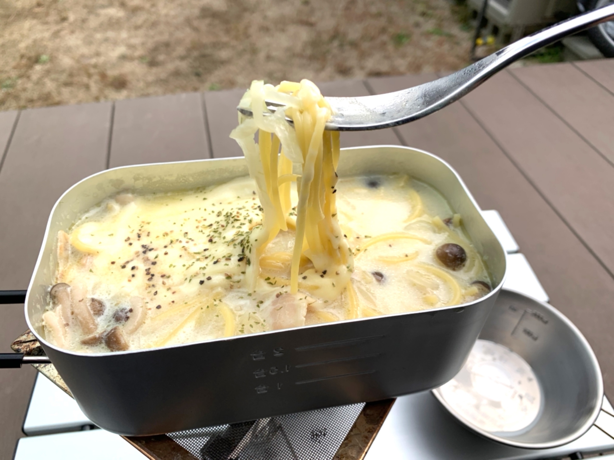 キャンプ パスタ 折らない- でも湯がいたパスタをスキレットで湯がくだけなら面白くない。 メスティンのように湯がいたときに水分がなくなるように 作りたいと思います。 水分を捨ている行為がなくなるだ
